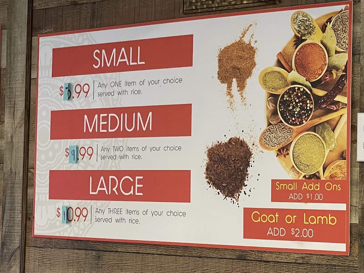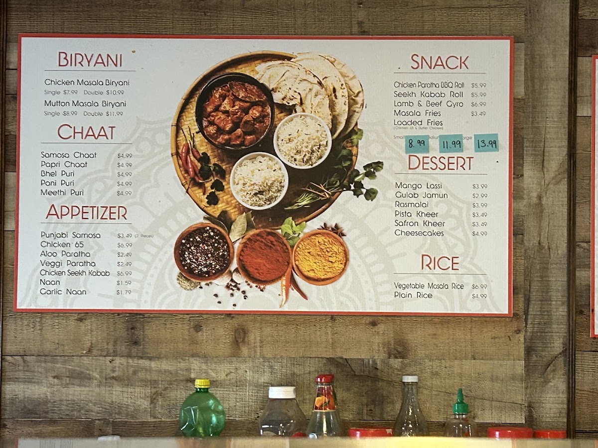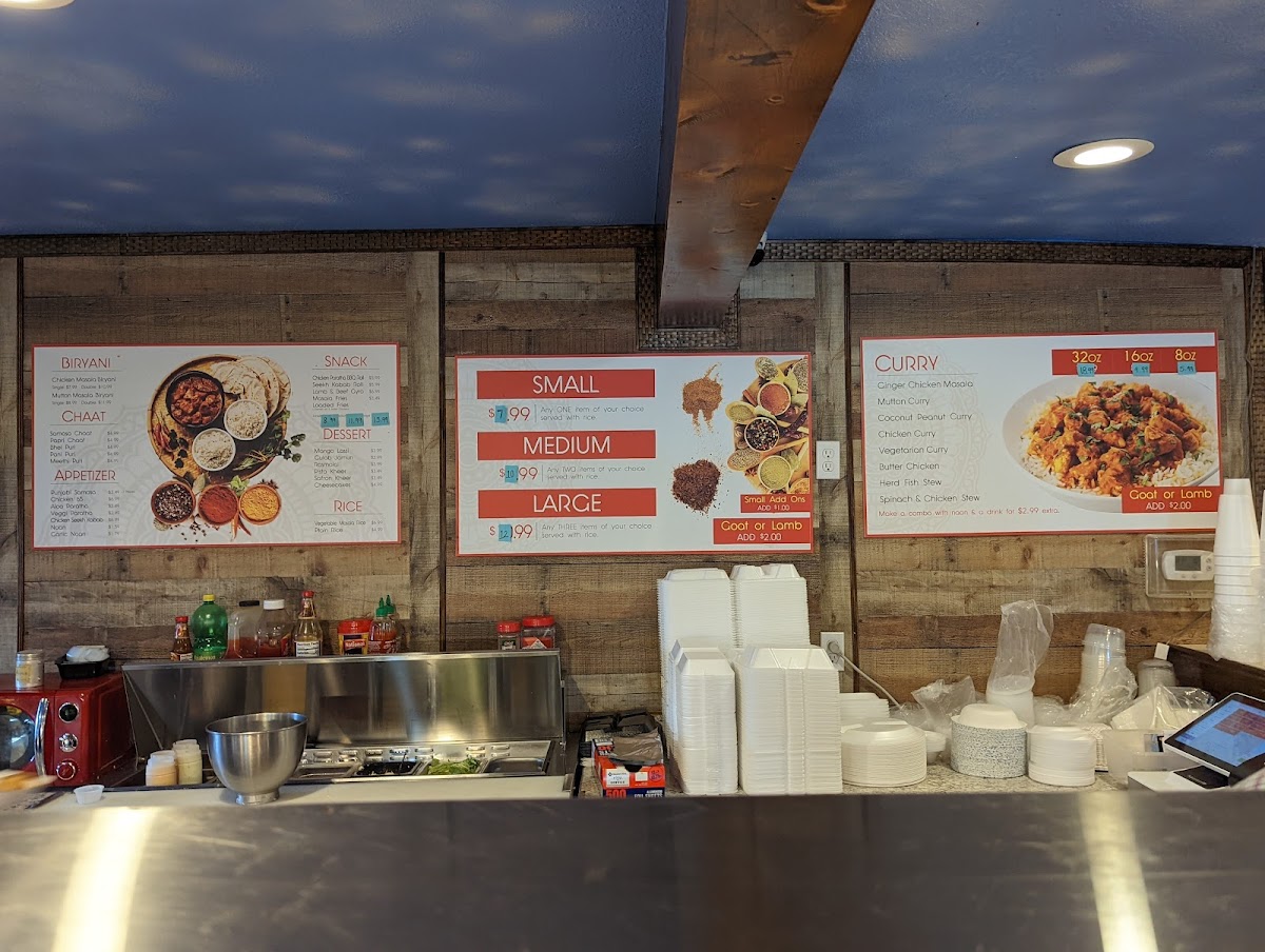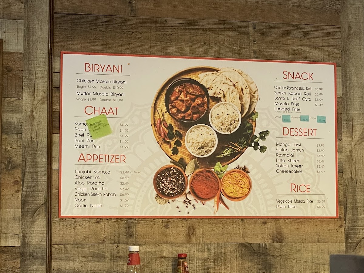 Alongside the hearty mains, the menu features satisfying appetizers such as samosas and chicken egg rolls, perfect for a light bite or starting off a meal. Complementing the food selection is a range of bottled drinks and refreshing fountain sodas, adding a familiar comfort to the vibrant spices on the plate.