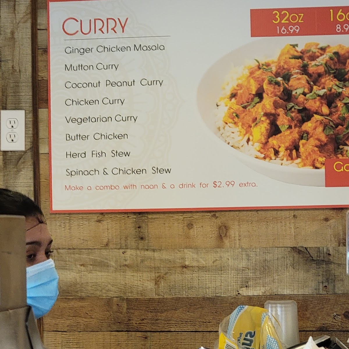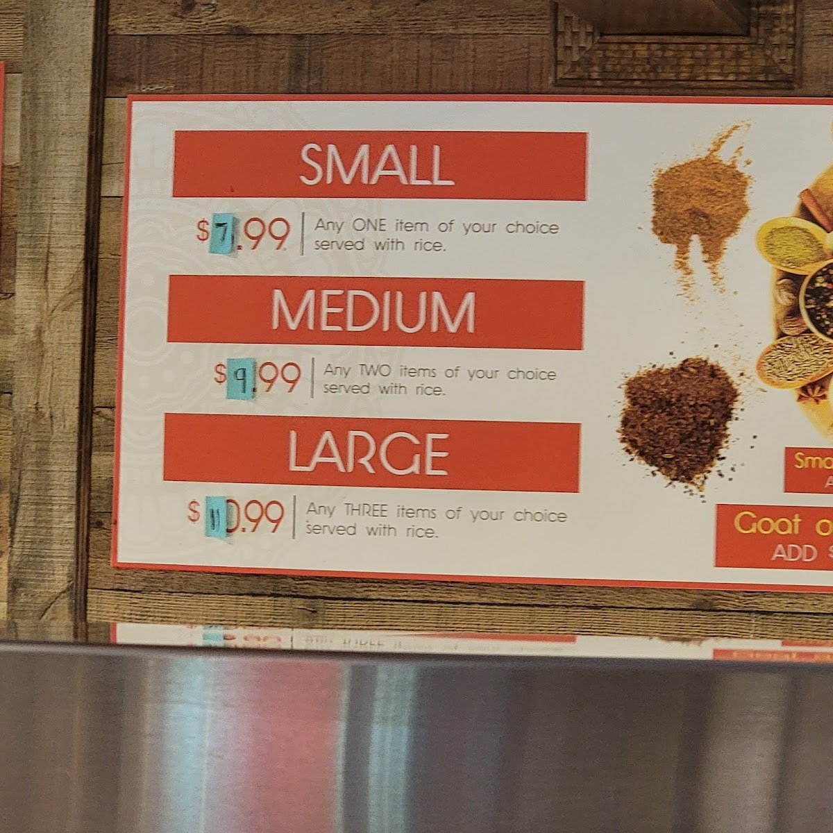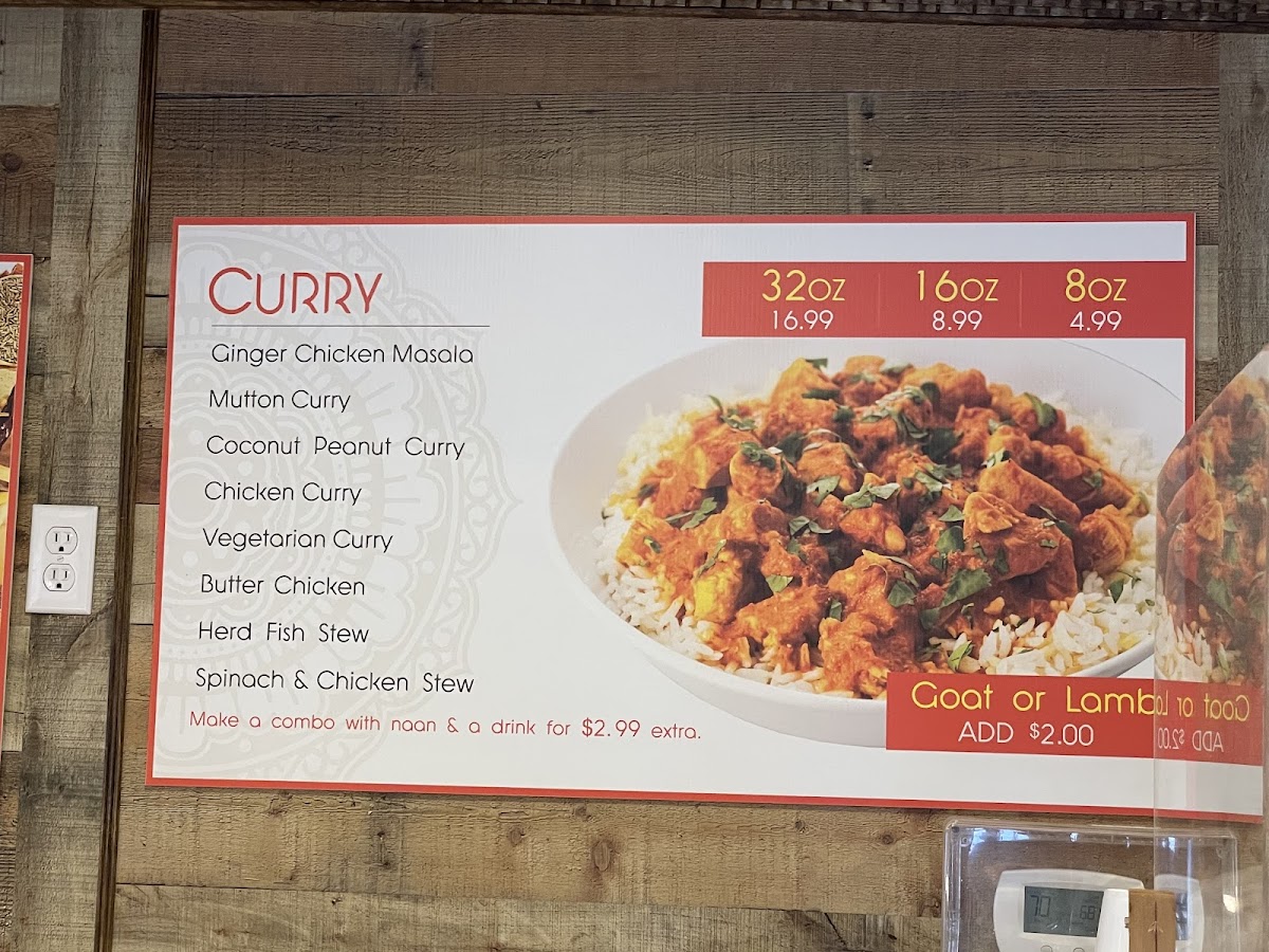 Alongside the hearty mains, the menu features satisfying appetizers such as samosas and chicken egg rolls, perfect for a light bite or starting off a meal. Complementing the food selection is a range of bottled drinks and refreshing fountain sodas, adding a familiar comfort to the vibrant spices on the plate.